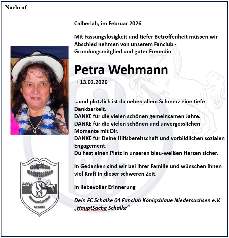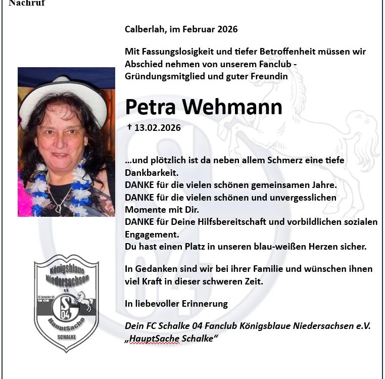 Mit Fassungslosigkeit und tiefer Betroffenheit müssen wir Abschied nehmen von unserem Fanclub-Gründungsmitglied und guter Freundin Petra Wehmann († 13.02.2026) und plötzlich ist da neben allem Schmerz […]